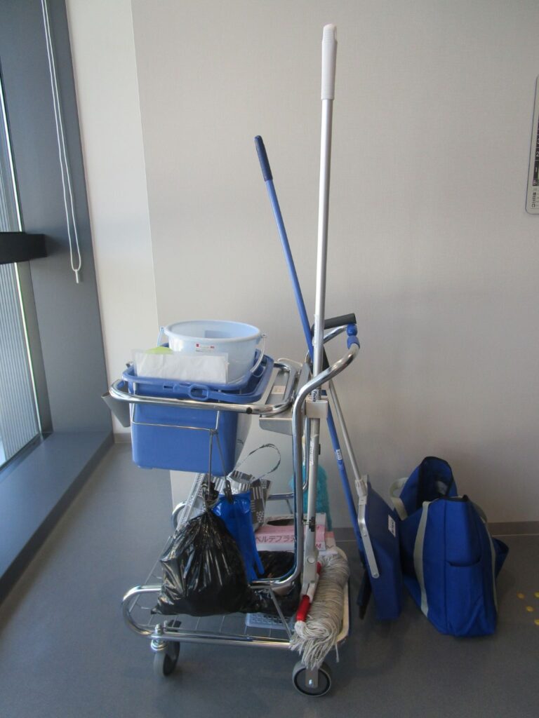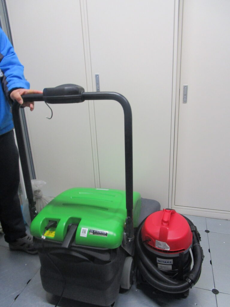 掃除道具も様々。清掃場所によって道具も使い分けておられました。機械も導入されていて、時間短縮にもつながっていました。