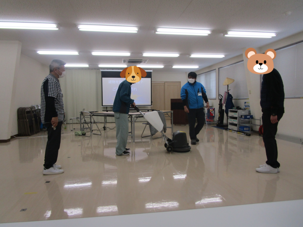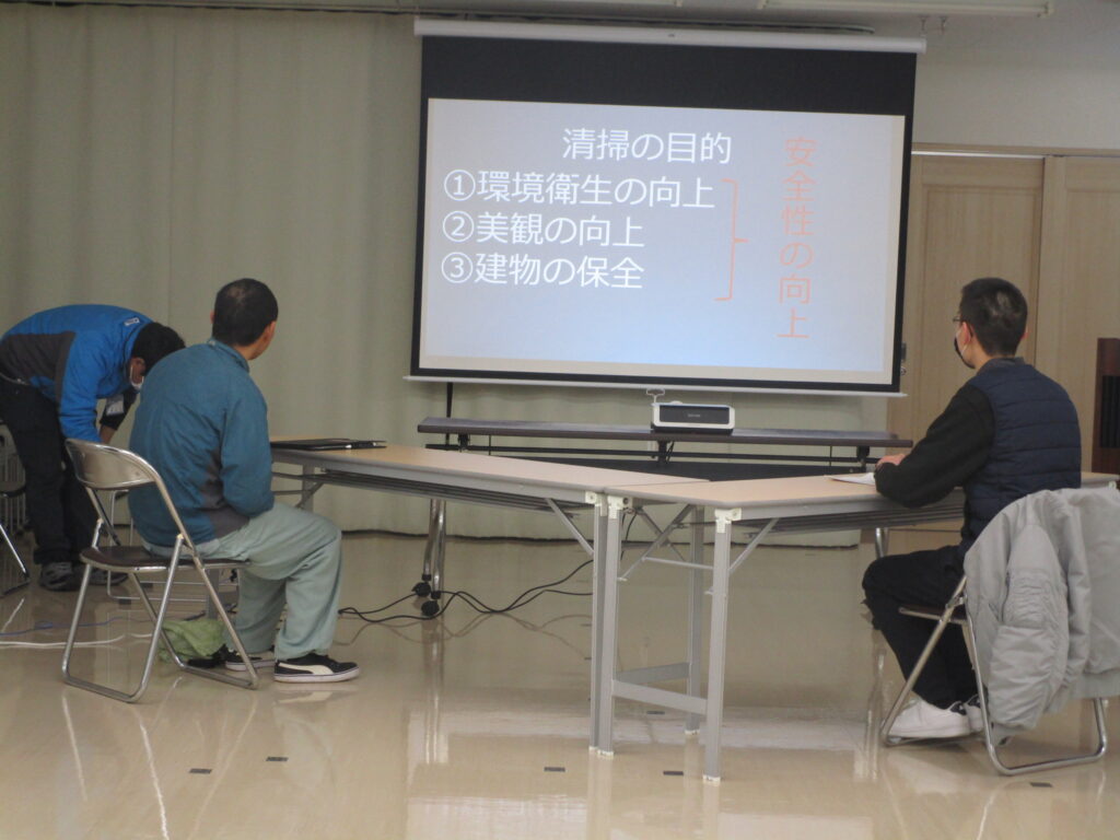 昼食の後は座学です。なぜ清掃が必要なのか?改めて考えることにより、清掃業務が私たちの生活にとってとても重要なことを再認識することができました。