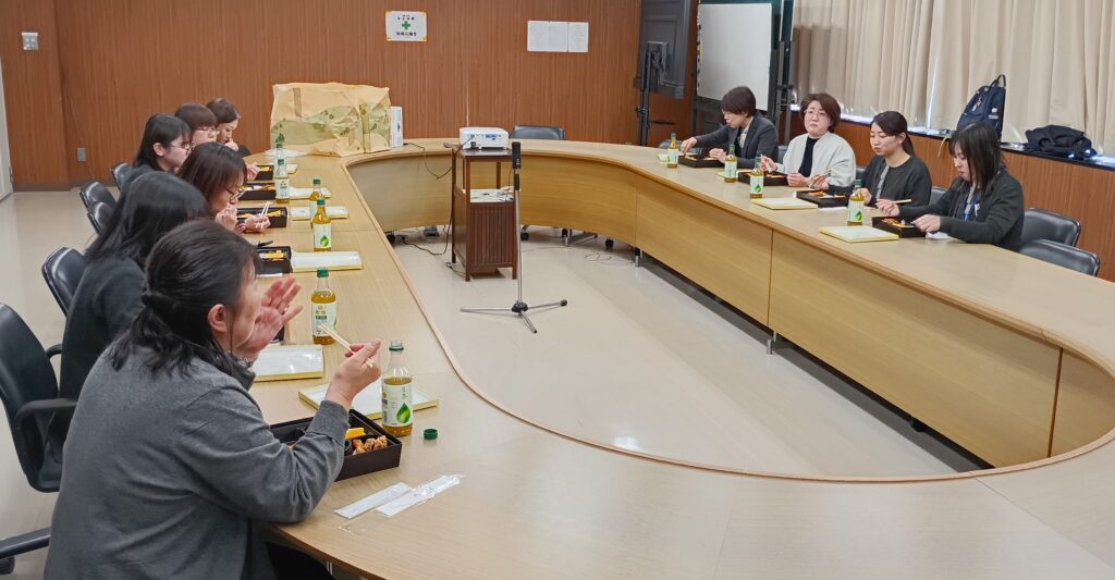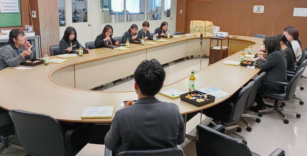 さあ、お待ちかねのランチタイムです。これからはお弁当を食べながら、女性社員の皆さんと一緒にランチ交流会です。子育てや働き方についての質問を中心に、和気あいあいと会話も進み、職場の雰囲気も伝わってきました。